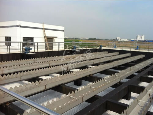 齿形集水槽两侧采用齿形堰板与槽体侧板拼装而成,拼装孔为囊形具有可调性,堰齿角度为90°,堰齿大小一般有80×160、100×200两种形式,集水槽厚度一般采用3~6mm。