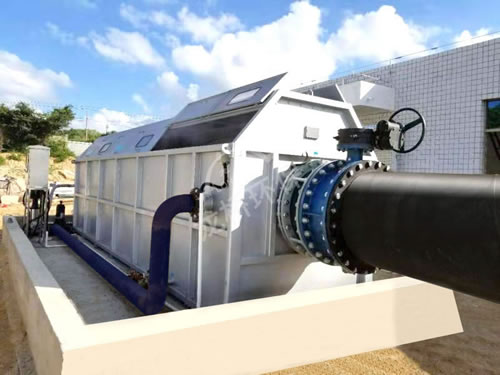 设备内部设有自动启闭开关,当滚筒有水进入时,液位传感器将发出信号,启动减速驱动系统驱动滚筒转动,同时启动反冲洗泵。污水流入空心滚筒内,滚筒上为高强度不锈钢滤网。污水由滤网内侧向外侧流出,污水水中的悬浮物被截留在滤网内侧,冲洗水通过位于滚筒顶部的喷头由滤网外侧向内侧对滤网进行冲洗,冲洗下来的细小颗粒物质由设备内部的反冲洗水收集槽收集,并通过排污管排出设备。